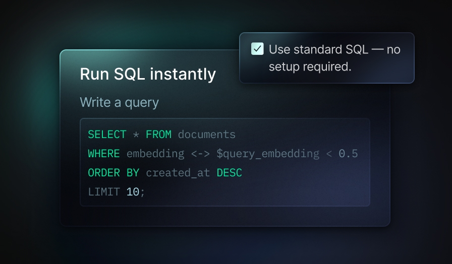 Combine vector search, full-text search, relational data, and SQL analytics in a single system. No glue code between databases.